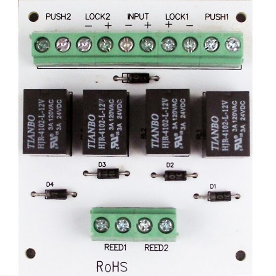 Access Control 2 Door Interlocking Module is a high security device that control 2 doors in and airlock situation. When used with our Door status range of magnetic locks 2 door interlocking is achieved allowing only 1 door to be open at a time. It can easily be integrated with fingerprint access devices or a simple press to exit button.